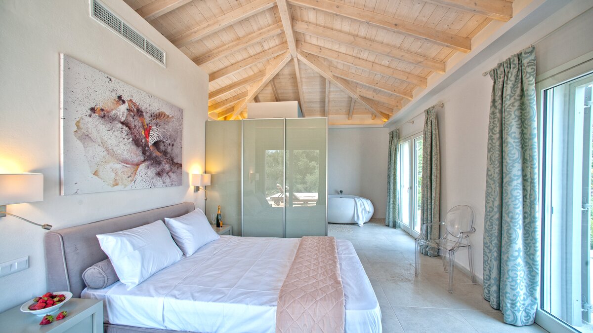 The villa’s outdoor facilities are equally inviting. A gorgeous infinity pool is set in a pebble-paved terrace, with sundowner seating at one end, and a generous shaded gazebo furnished for al fresco dining and relaxing. A 100m footpath leads down to the beach, and the villa is 1km from Barbati centre, and within easy reach of a beach with tavernas and water sport