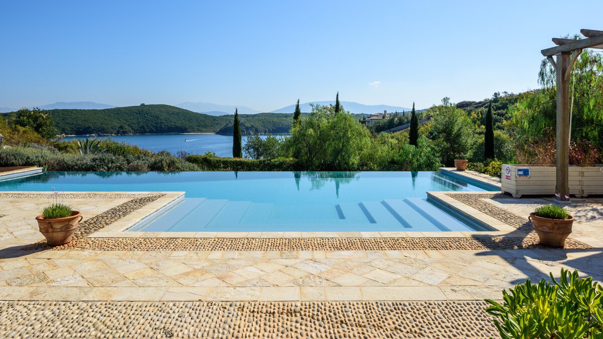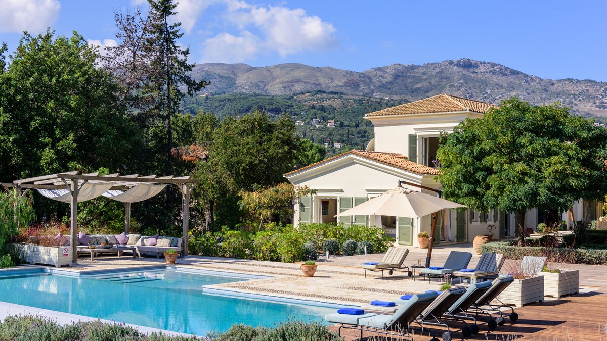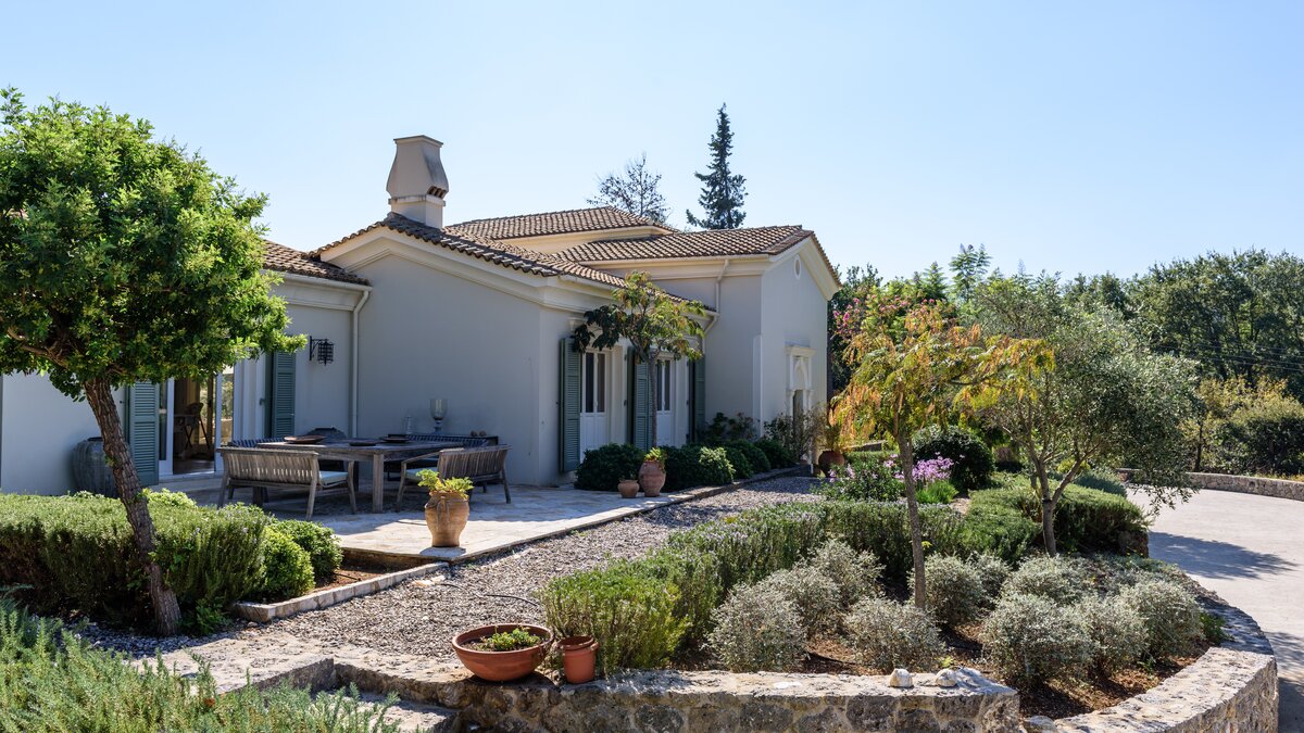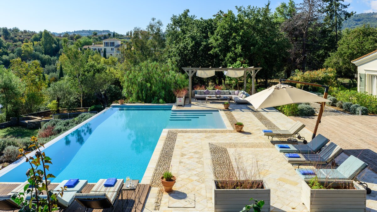 With neo-classical architecture and contemporary comforts, this lovely villa is peacefully positioned between Avlaki and Coyevinas, with a choice of beaches a five minute stroll away. Standing in stylishly landscaped gardens, the house looks out to sea across a hugely spacious terrace, where broad timber sundecks and a pretty pergola complement a gorgeous heatable infinity pool. Inside, the villa blends informal elegance with eclectic furnishings and objets d’art, creating the welcoming feel of a much loved home.On the ground floor, a comfortable sitting room and spacious kitchen open out to covered verandas for al fresco lounging and dining, and three en suite bedrooms each have French doors on to the open terrace. The master suite has the first floor all to itself, complete with a private balcony, and tucked away at lower ground level is an air-conditioned sitting/TV room. Cook service can be pre-booked here for an extra leisurely break, and excellent eateries are a very short drive away in Kassiopi and St. Stephano.