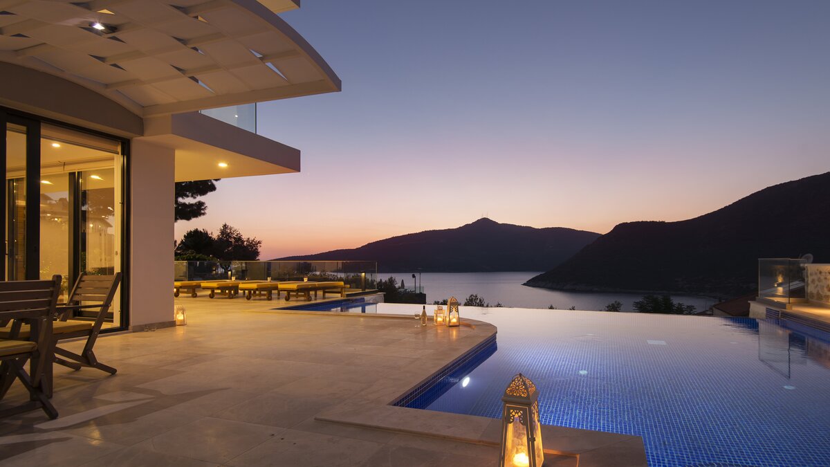 Denna moderna villa med fem sovrum erbjuder en exceptionellt hög standard på boende i ett utmärkt läge nära Kalamar beach club, en av Kalkan's bästa strandklubbar. Samtida arkitektur och design blandat med extraordinära vyer över havet har tillsammans skapat några fantastiska livsrum som är perfekta för en grupp vänner eller en utökad familjegrupp.