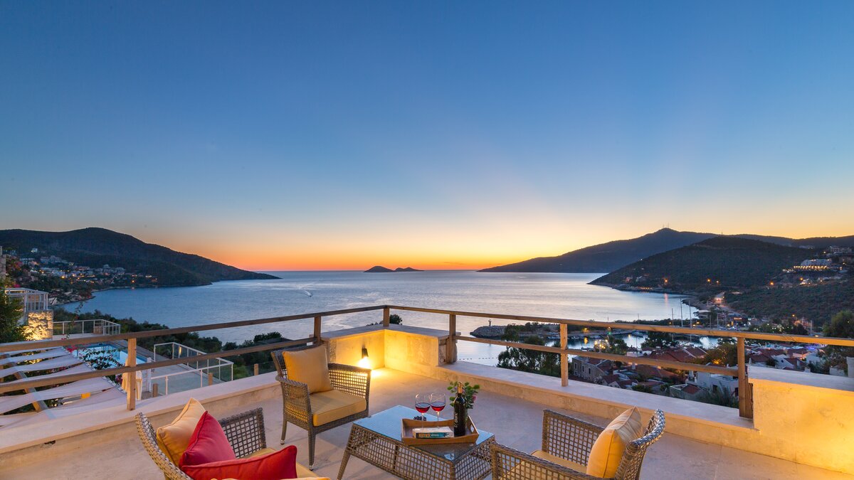 Villan inuti är inredd med antikviteter och konstverk av hög kvalitet och består av huvudbyggnaden i 2 plan och de 3 våningarna i det intilliggande andra huset. Ett underbart öppet kök och matplats står i centrum på bottenvåningen i huvudbyggnaden. Mycket modern stil, med eleganta trämöbler och en stor kyl/frys och kaffebryggare, fortsätter rummet runt hörnet till det färgglada vardagsrummet – det finns gott om soffutrymme för kvällspaus, plus enkel tillgång till poolterrassen utanför. En trappa leder upp till ett underbart sovrum med dubbelsäng – ett udda glasfönster med eget badrum, med en justerbar sekretessskärm, en generös duschkabin, och stora dörrar leder ut till två vackra solterrasser med utsikt över bukten och Kalkan. Den andra byggnaden rymmer ytterligare tre sovrum – ett sovrum med dubbelsäng och tvåbäddsrum, båda med eget badrum på bottenvåningen, tillsammans med ett litet pentry för extra komfort och avskildhet. Ytterligare ett sovrum med eget duschrum (liknande stil som den i huvudbyggnaden) kompletterar första våningen, medan ett spelrum med bordtennisbord och luftkonditionerade gym utgör byggnadens nedre våningsplan.