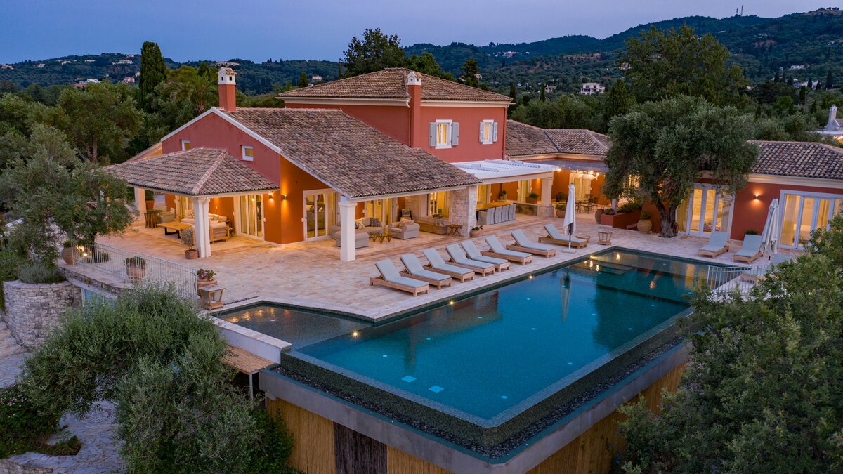 A fabulous ABOVE property, Villa Soukia sits at the water’s edge in Kassiopi with far reaching views out to sea, direct beach access. Inside, the property is spacious and tastefully decorated. From the entrance hall, guests can access the lovely, large living room with multiple French doors flooding the room with natural light and opening on to the terrace. The modern kitchen is fully equipped, while the outdoor kitchen is complete with a wood burning stove. Three en suite double bedrooms also occupy the ground floor, one of which has a private outdoor shower, while another has a private terrace. The master bedroom occupies the first floor, complete with an en suite bathroom, a dressing room and a private terrace for enjoying the view. A separate annexe building contains a further four en suite double bedrooms, perfect for multi-generational holidays.